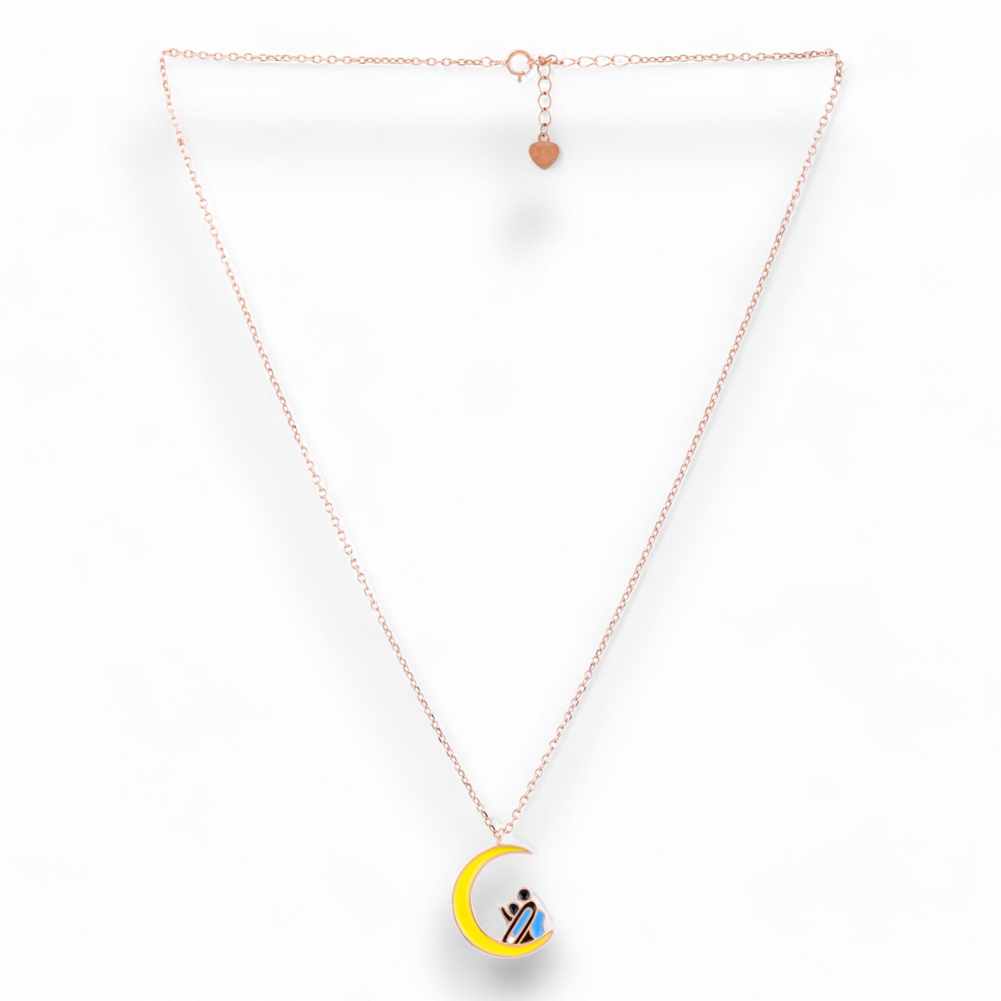Capture the essence of love under the moonlight with the Lunar Romance Necklace. Featuring a romantic crescent moon and couple pendant on an anti-tarnish rose gold chain, this necklace is the perfect symbol of timeless affection.