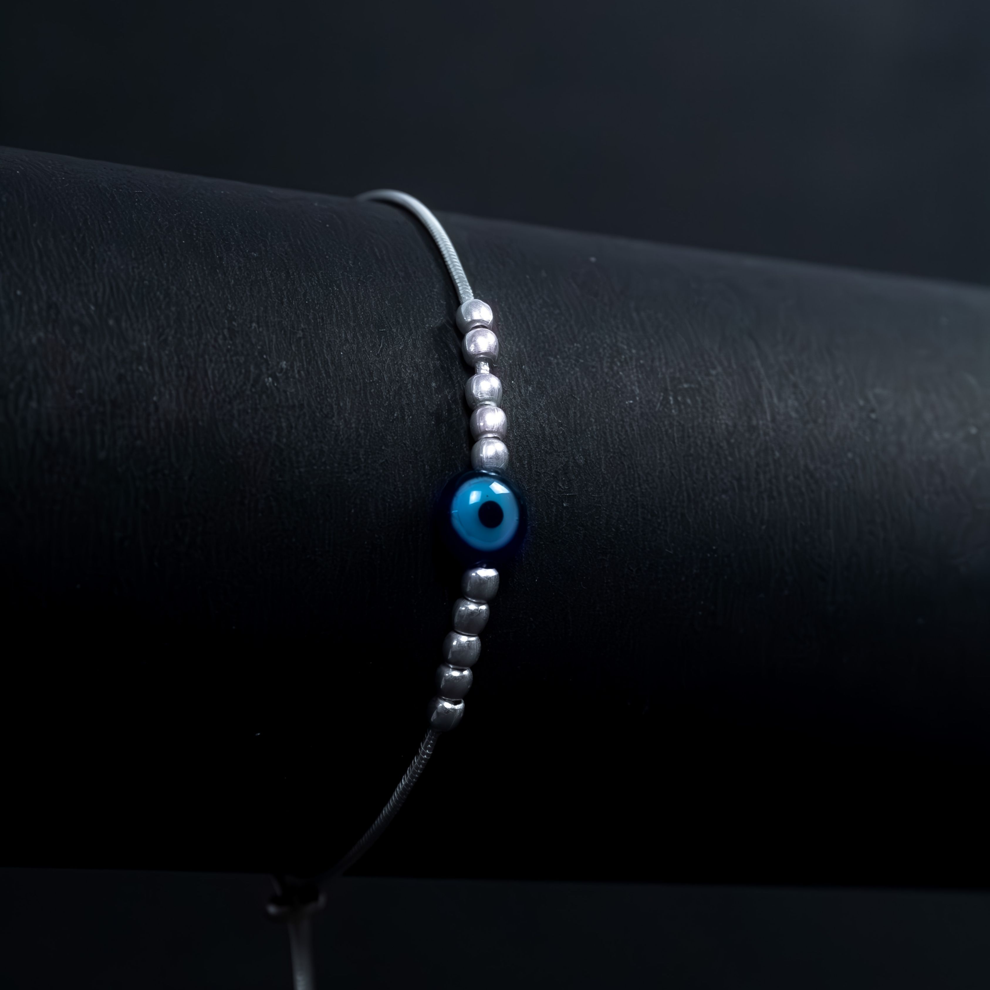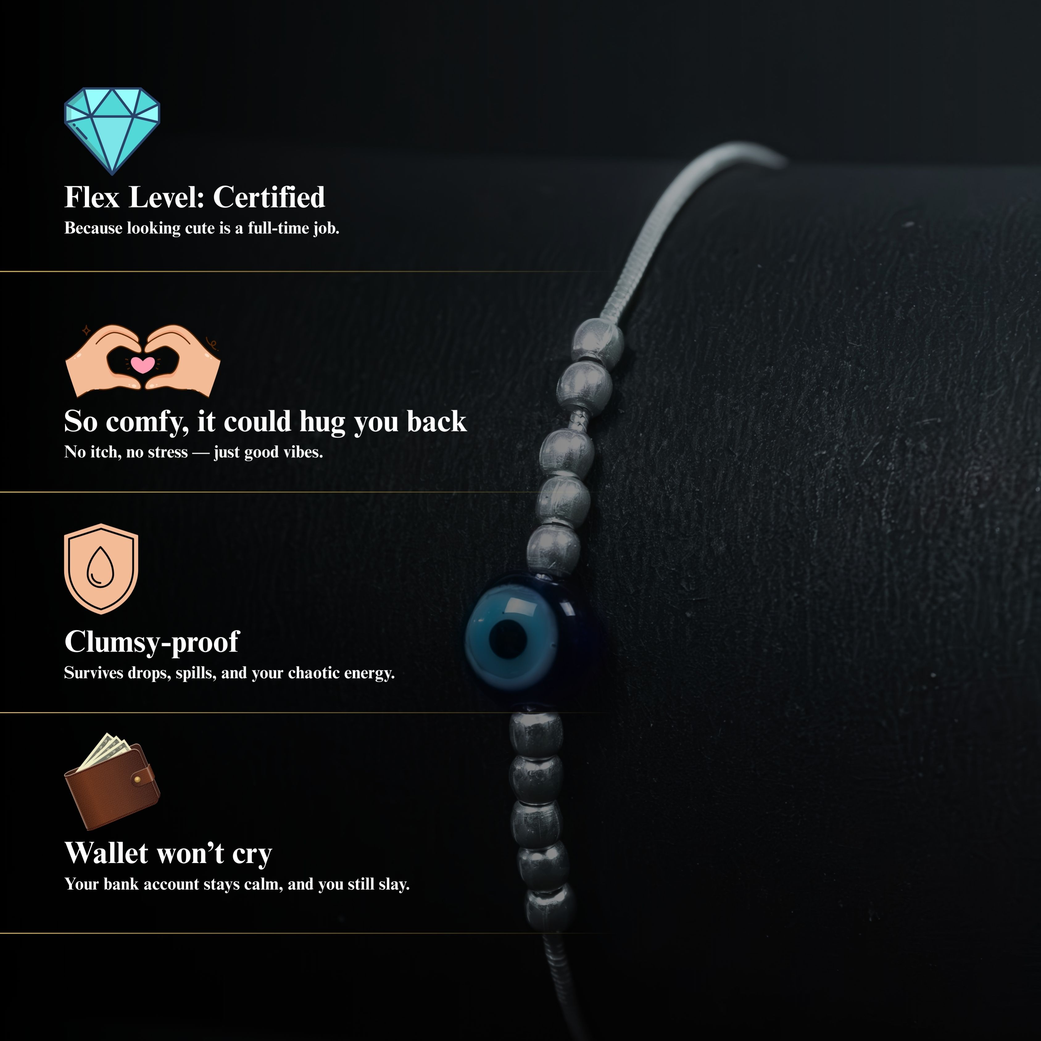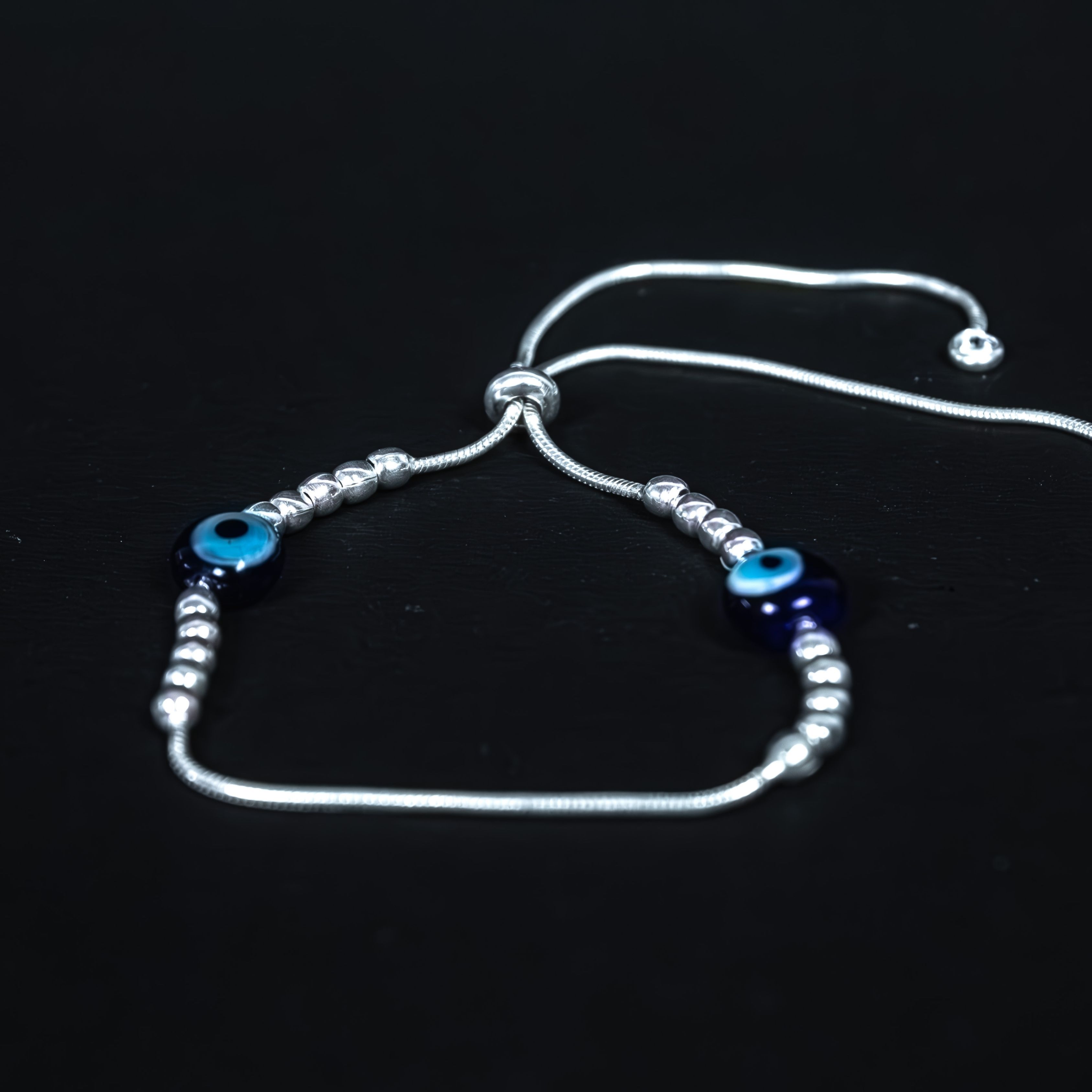 Crafted in 92.5 sterling silver, it features classic evil eye beads known for warding off negativity — all wrapped in a sleek adjustable chain for all-day comfort and style.
