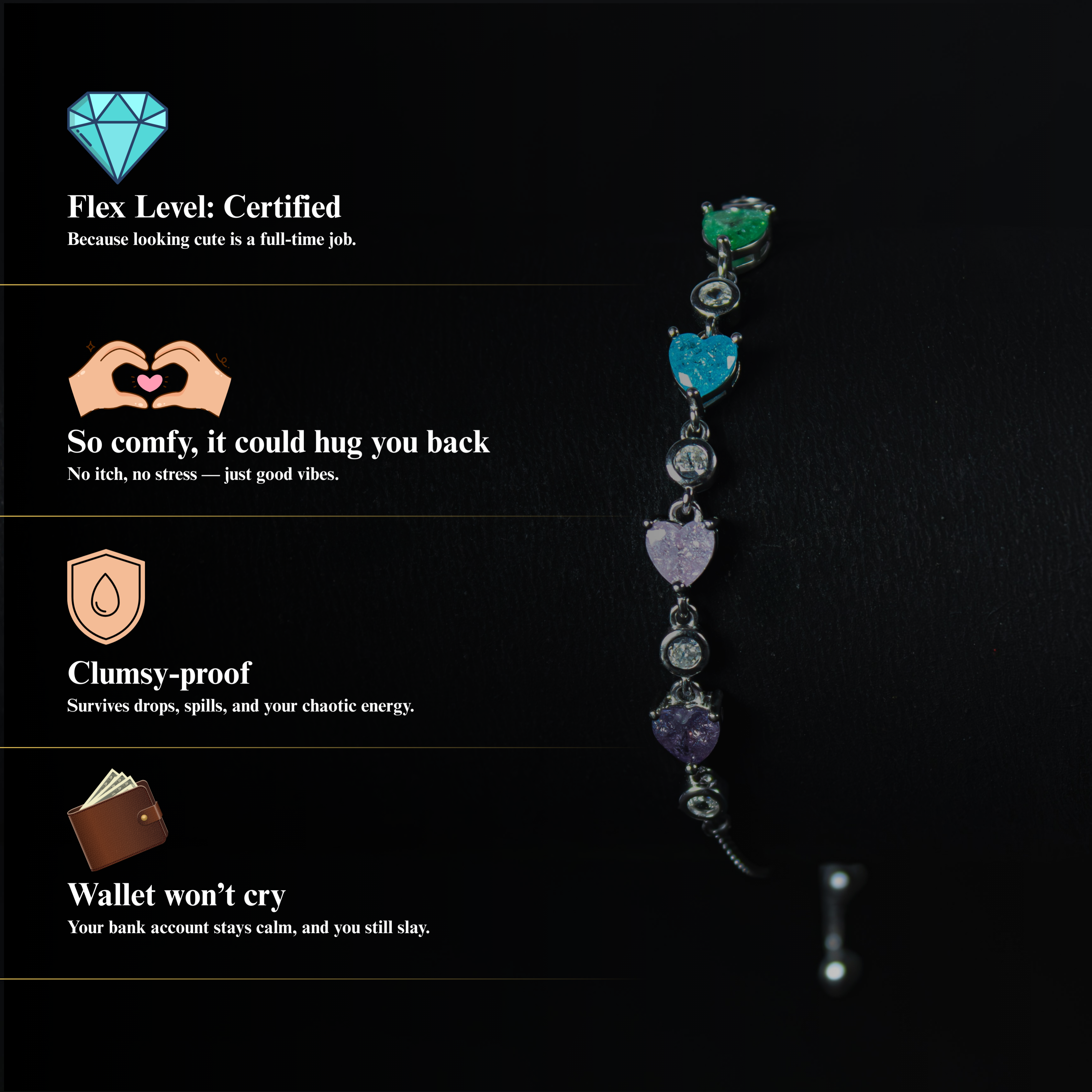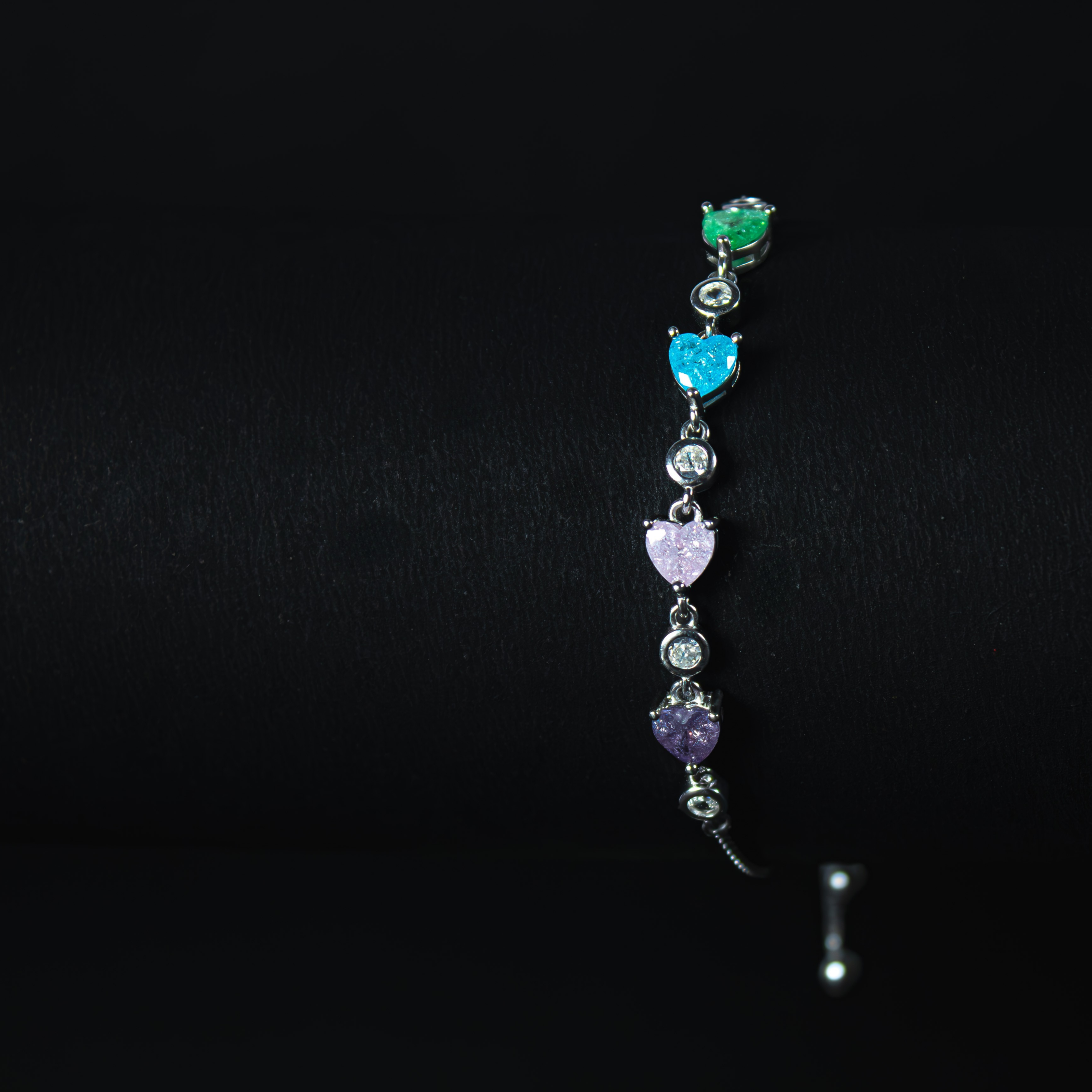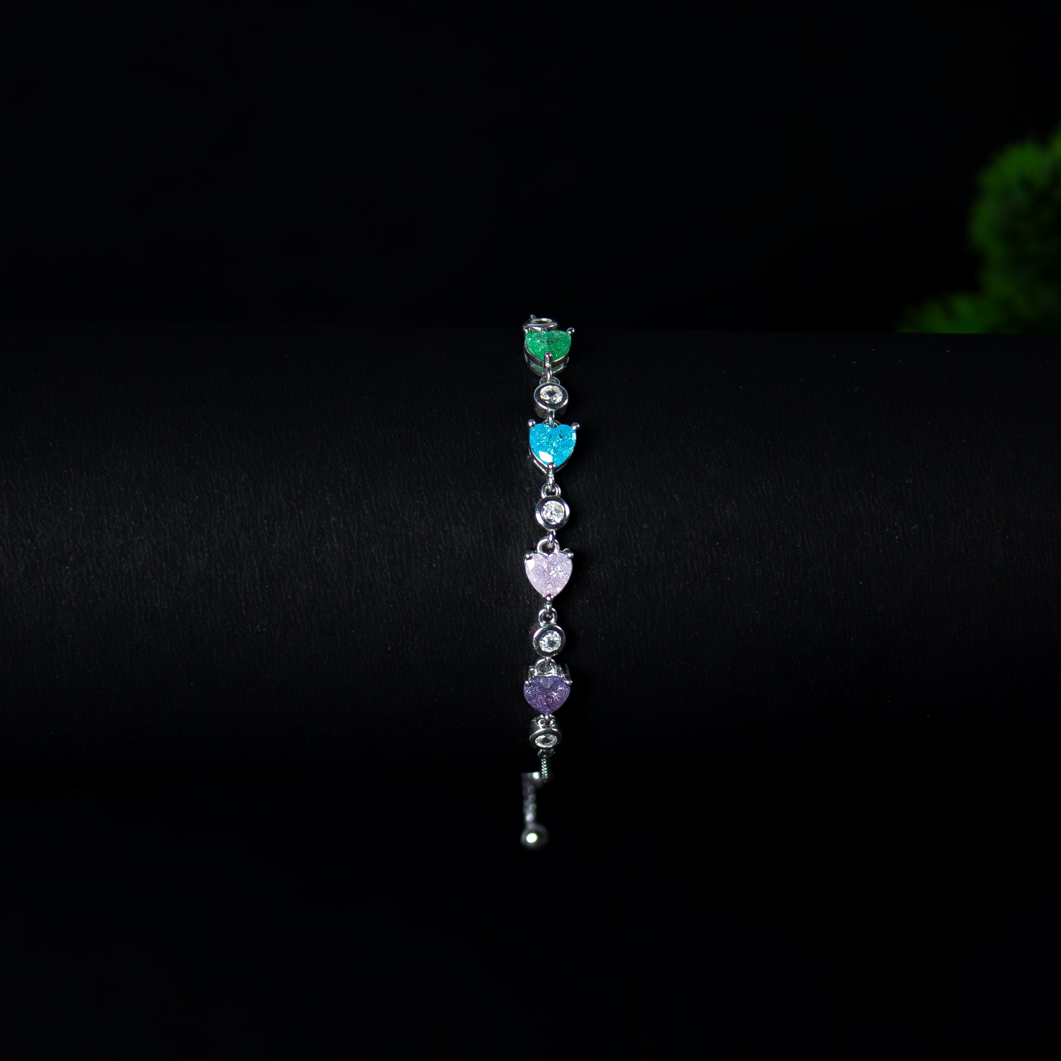 A silver bracelet with soft-hued heart gems — designed to match your every mood. Pure 92.5 silver. Statement-ready. Never basic.