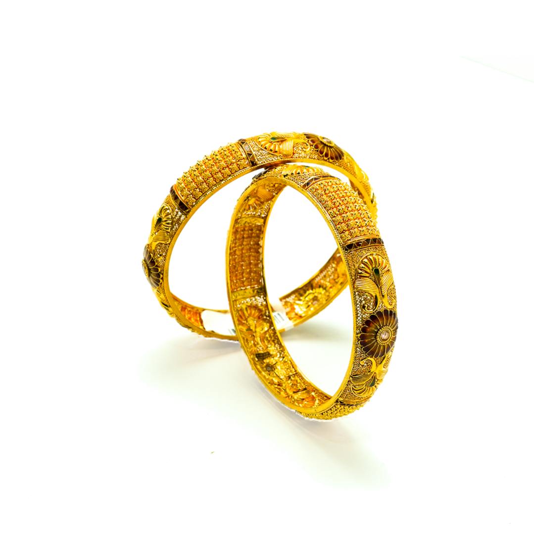 Our collection features an exquisite range of 22K and 18K BIS-hallmarked gold bangles, ensuring the highest level of purity and trust. Whether you prefer classic plain gold bangles, intricately carved temple designs, or modern stone-studded creations, we have something that complements every style and occasion.