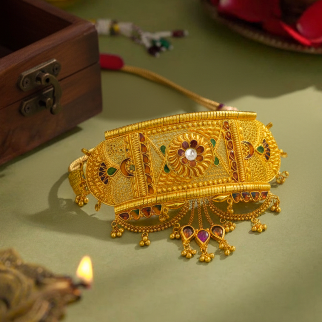 Pure Gold Bajuband – A touch of tradition and luxury. Perfect for weddings, temple functions, and cultural celebrations.