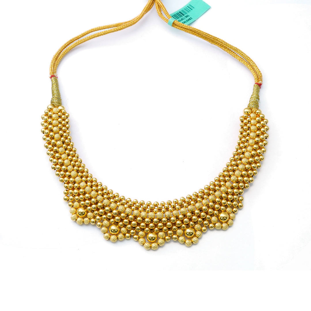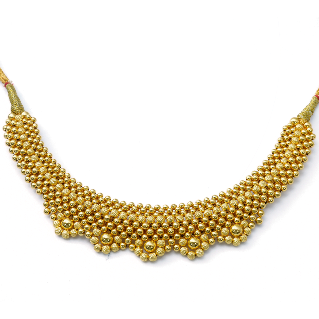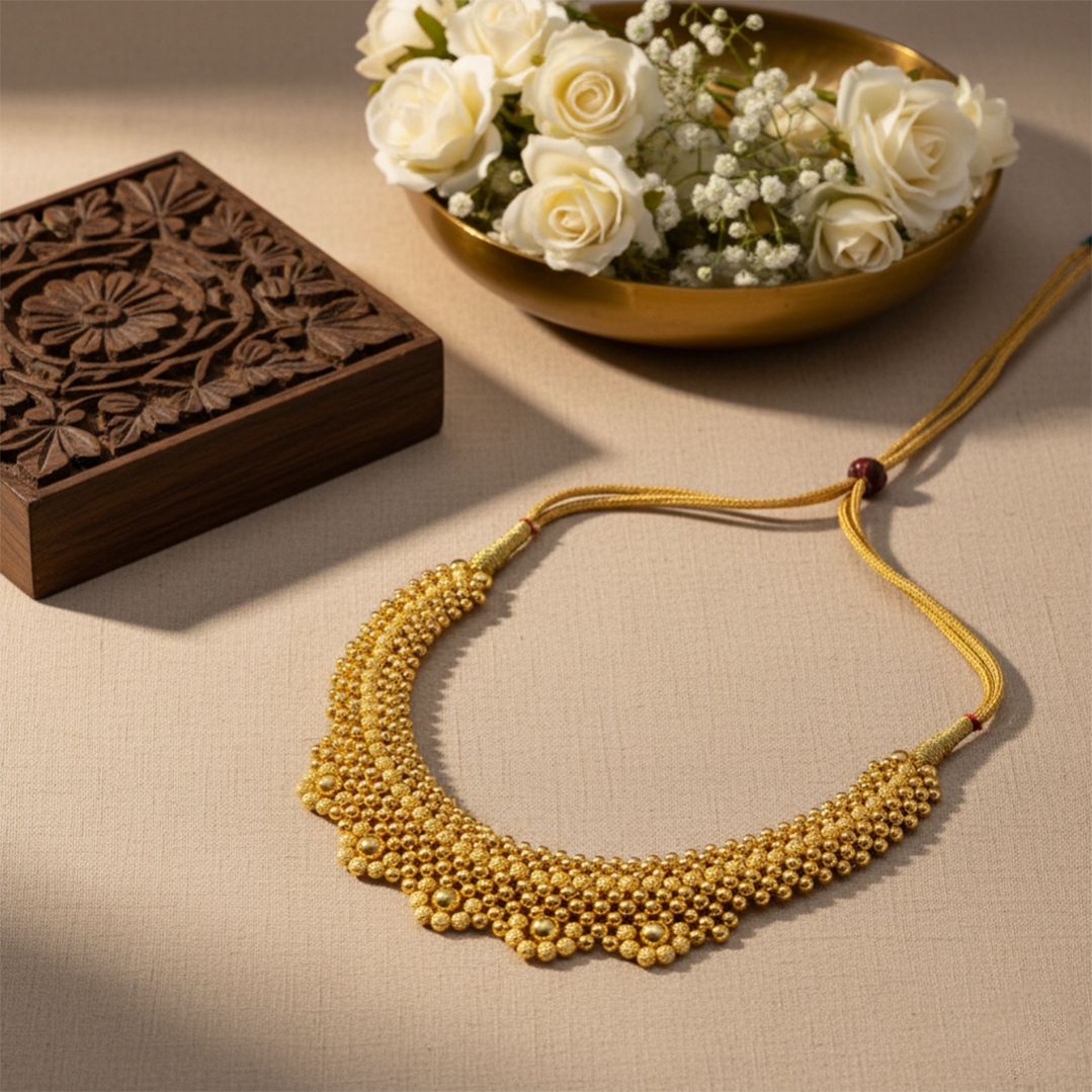 Gold Kanthi is a traditional necklace, often worn close to the neck, symbolizing purity and devotion.
