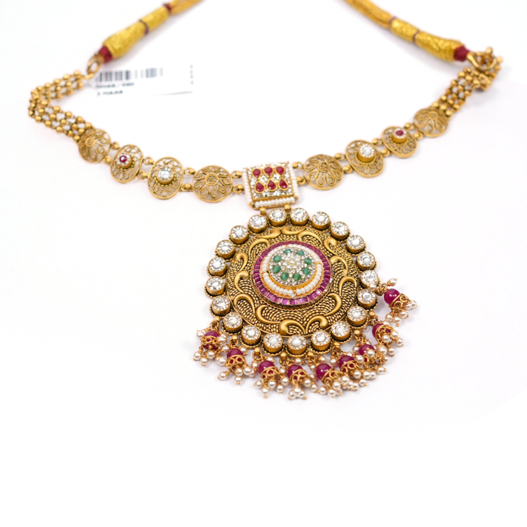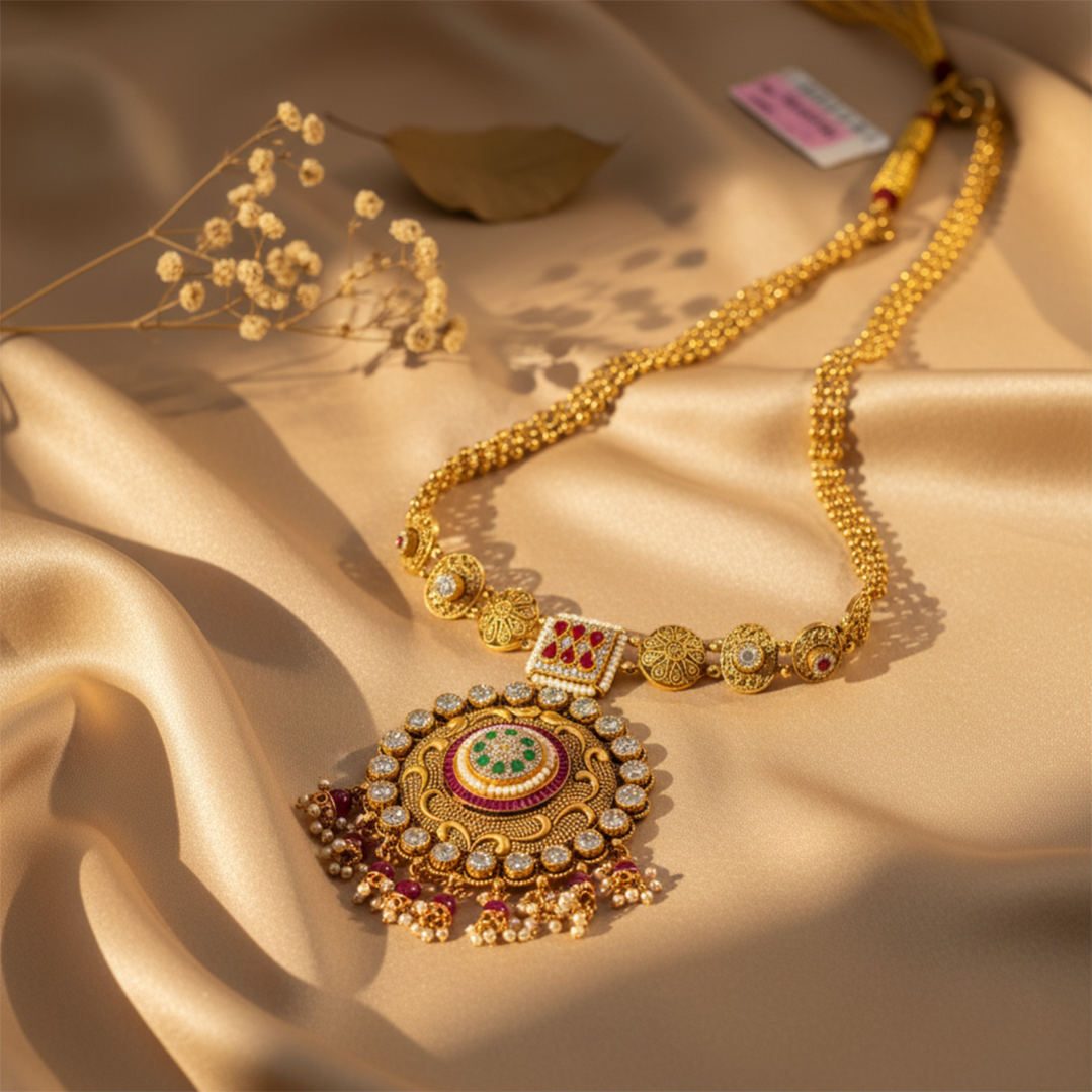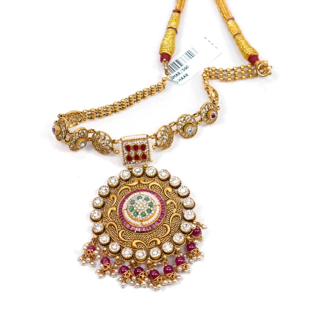 A finely crafted haar cut featuring intricate patterns and elegant detailing that enhances the beauty of traditional jewellery.
