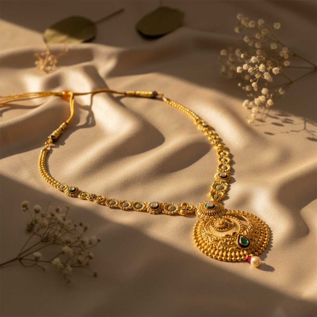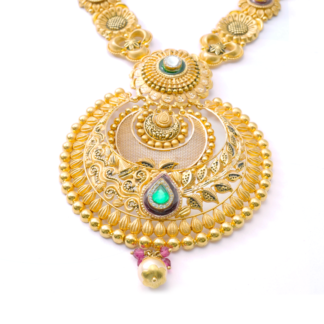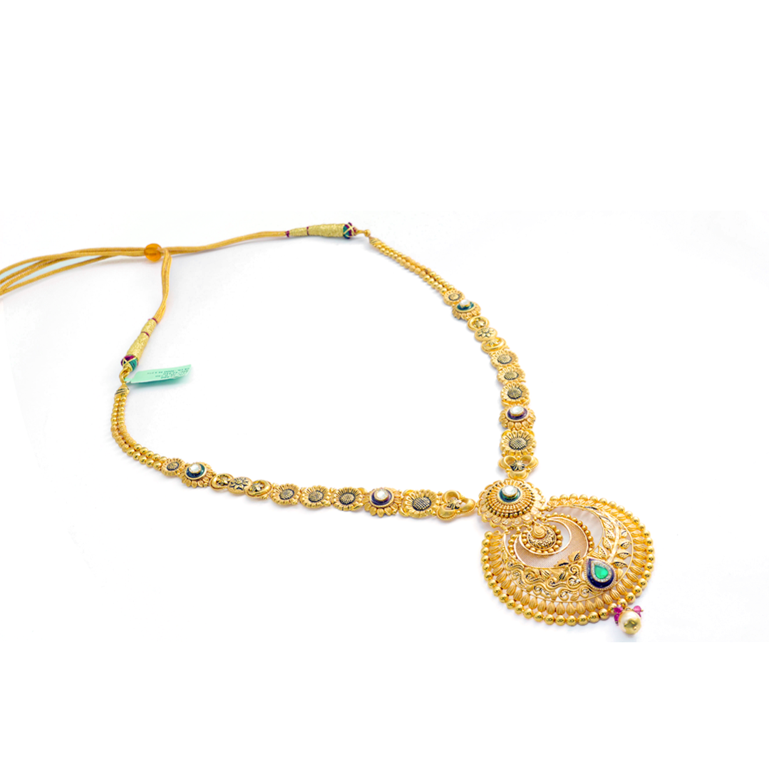 A traditional gold haar crafted with intricate detailing, adding regal elegance to any festive or bridal look.
