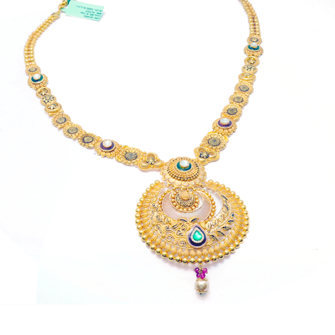This exquisite gold haar showcases timeless craftsmanship with its beautifully detailed design, making it a stunning statement piece for weddings, festivals, and special occasions. Designed to reflect traditional artistry, the haar features intricate patterns, smooth finishing, and a luxurious shine that elevates any ethnic attire. Whether paired with lehengas, sarees, or bridal ensembles, this gold haar adds a royal charm and rich cultural heritage to your style. Perfect for those who appreciate classic jewellery with a touch of grandeur.