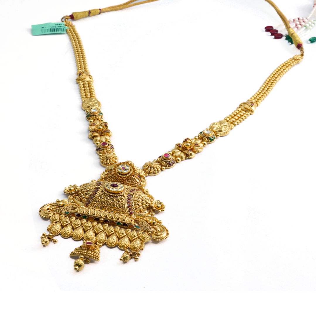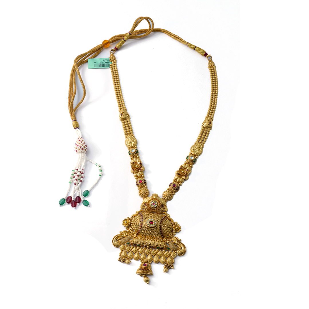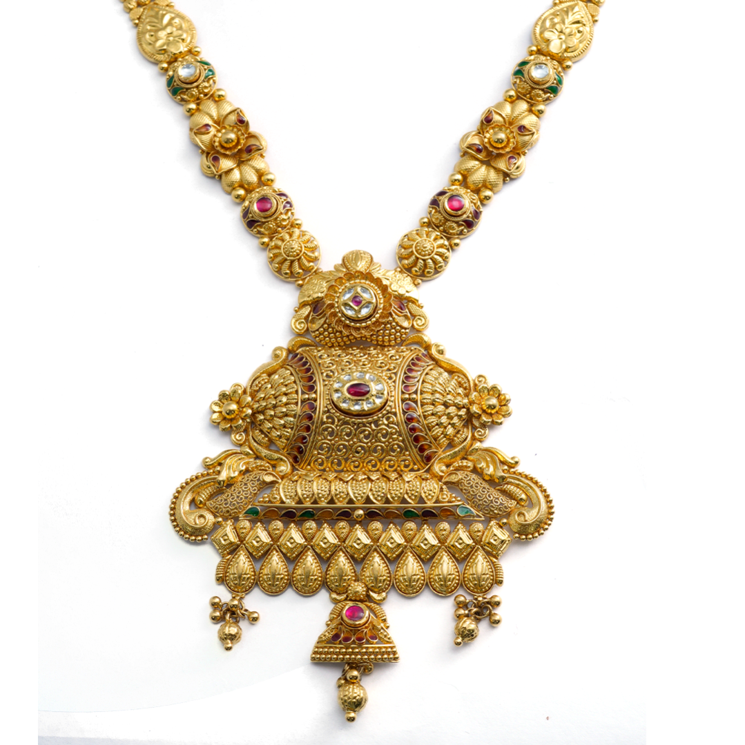 A traditional gold haar crafted with intricate detailing, adding regal elegance to any festive or bridal look.