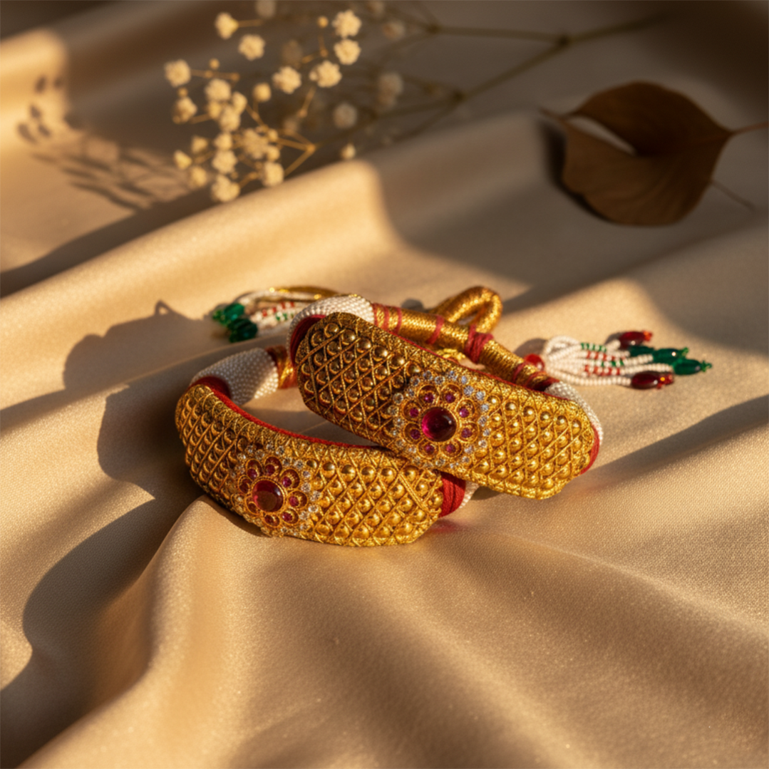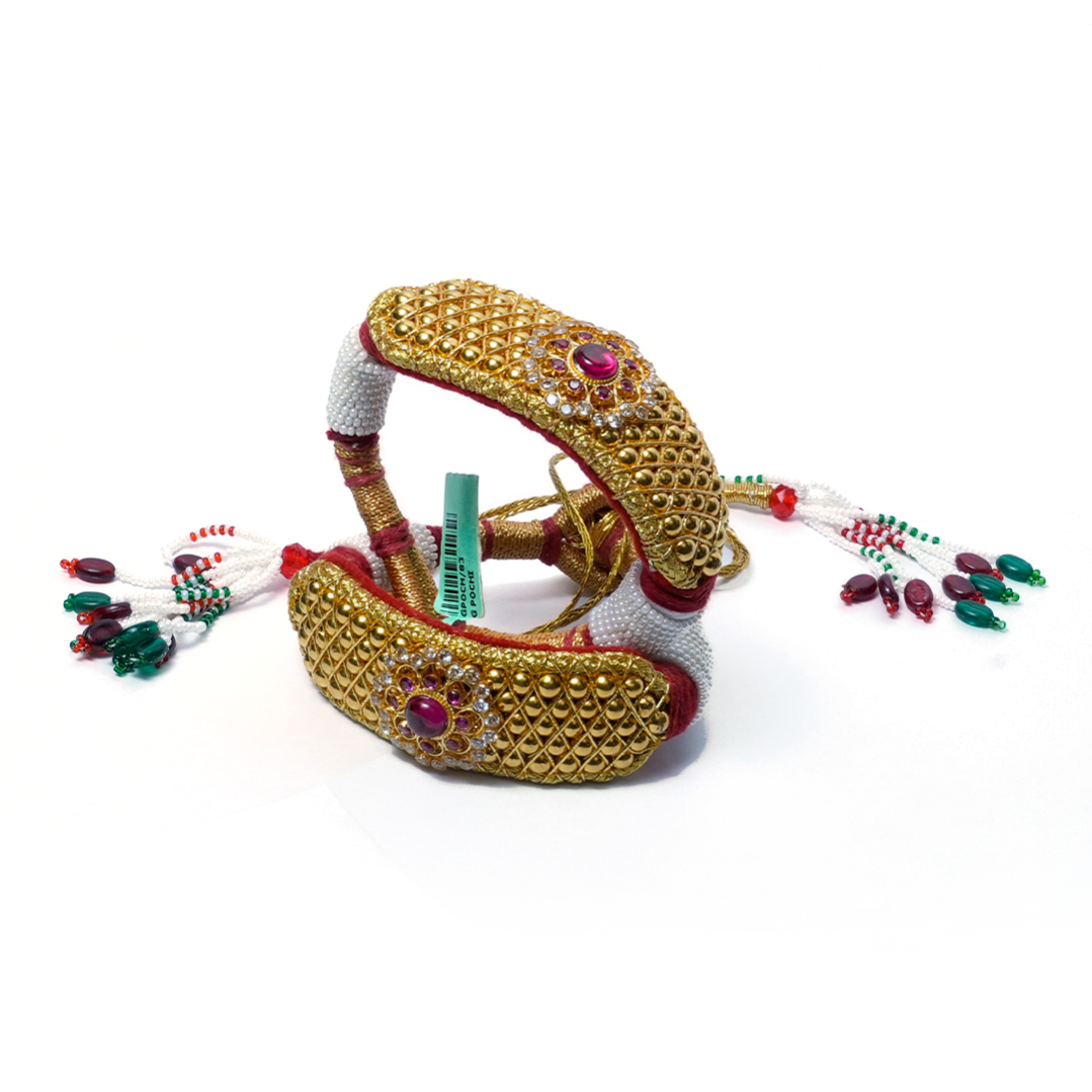 This stunning gold baju features intricate detailing and traditional craftsmanship, making it a perfect accessory for weddings, festivals, and cultural celebrations. Crafted with precision, the armlet showcases elegant motifs, smooth finishing, and a radiant gold shine that enhances any traditional attire. Whether worn by brides or paired with festive outfits, this gold baju brings a graceful and timeless touch to your overall look. Its lightweight yet luxurious design ensures comfort while adding a royal appeal to your ensemble.