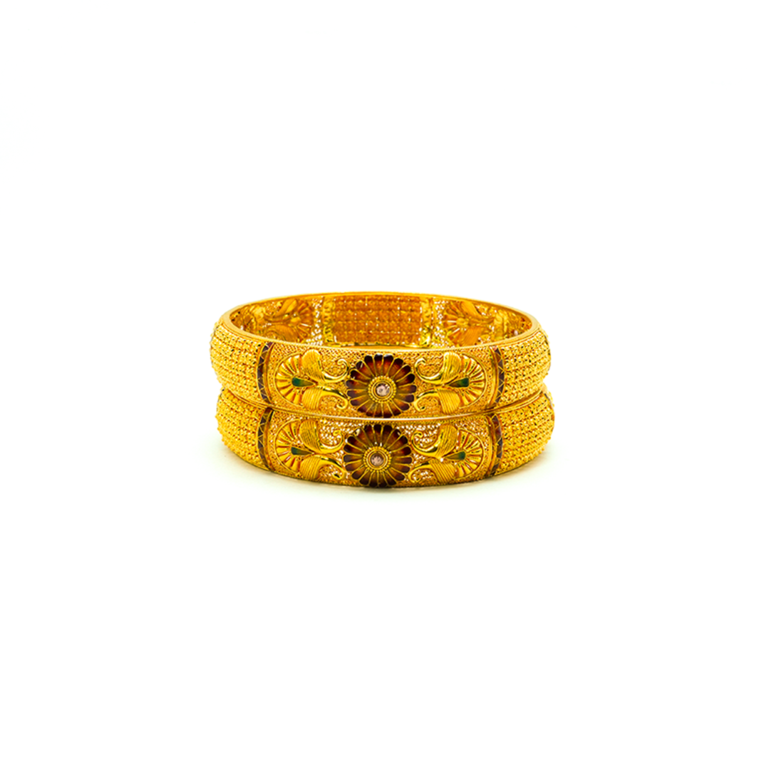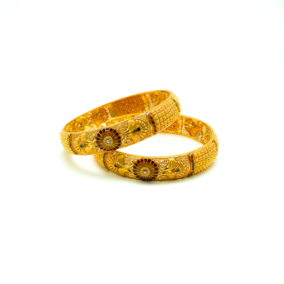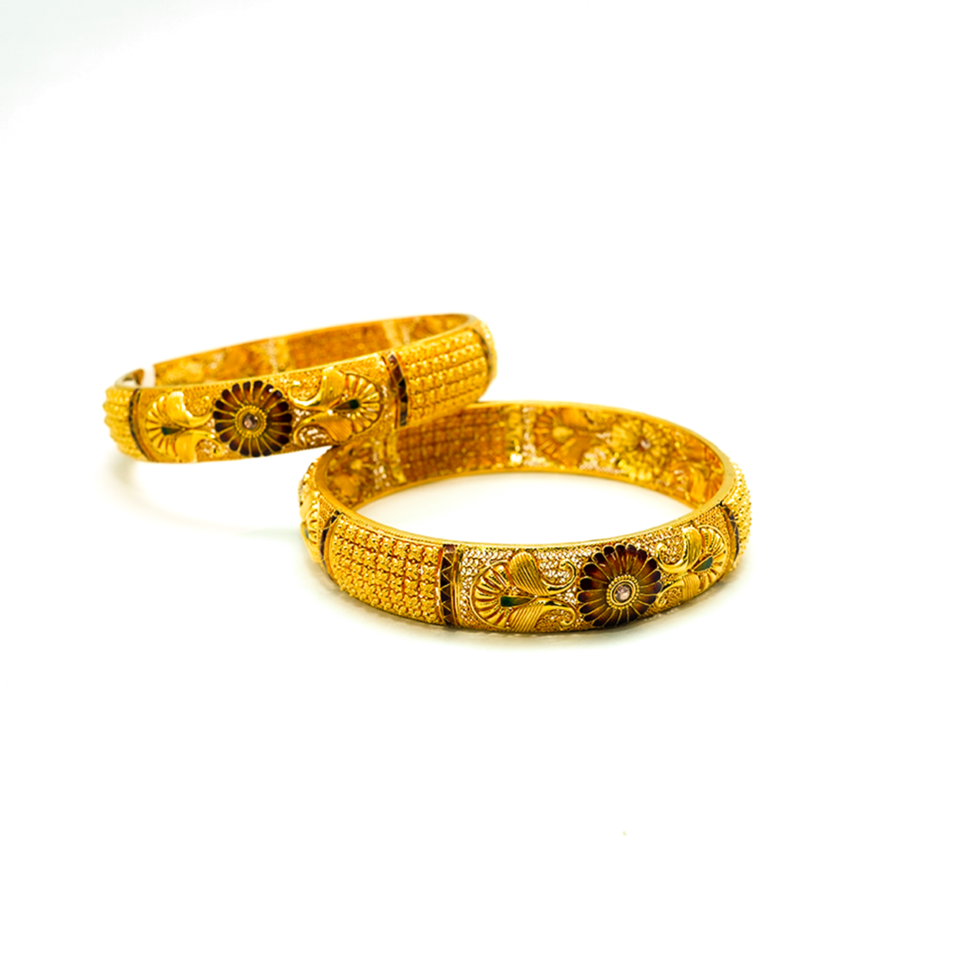 Our collection features an exquisite range of 22K and 18K BIS-hallmarked gold bangles, ensuring the highest level of purity and trust. Whether you prefer classic plain gold bangles, intricately carved temple designs, or modern stone-studded creations, we have something that complements every style and occasion.